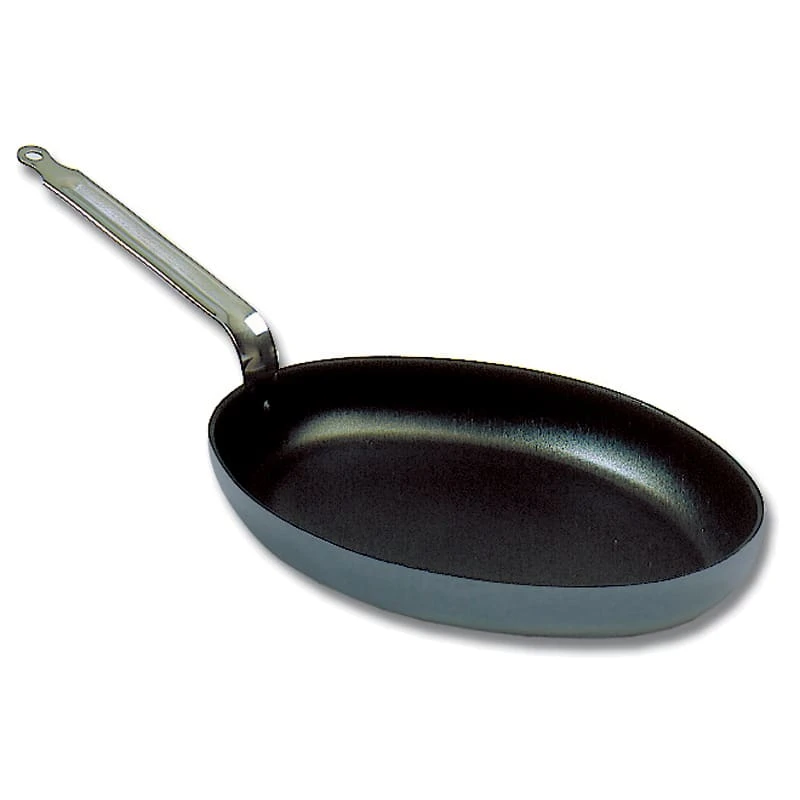 This Matfer Bourgeat oval fry pan has 4 layers of nonstick material. Fish or whatever you fry will not stick. Help preserve the nonstick coating by using Matfer Bourgeat Exoglass® utensils, items # 308848, 308849, or 308859.