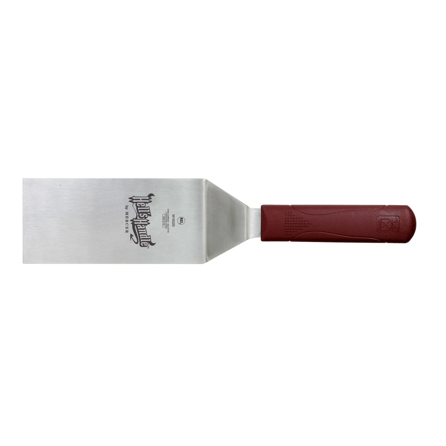 This Mercer Culinary® Hell’s Handle™ Turner has a square edge, making it ideal for use with burgers and sandwiches. Its handle is heat-resistant to 450°F and has a dual-textured finish for a better grip.