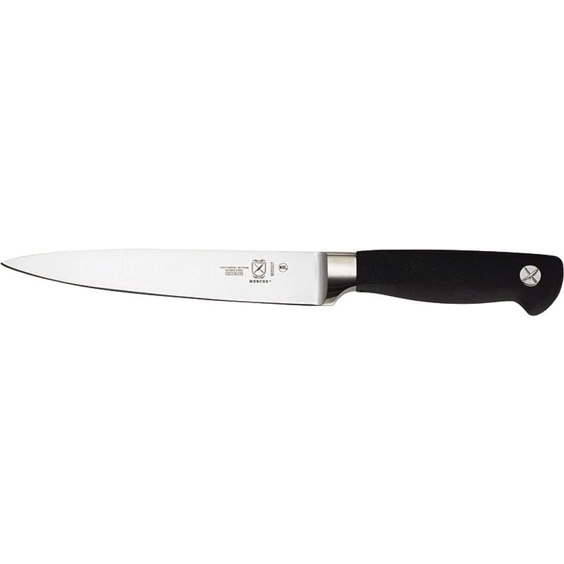 This Mercer Culinary® Genesis® Flexible Fillet Knife is great for removing membranes from meat and removing meat from bones. It is made from high carbon German steel and has an ergonomic black Santoprene® handle.