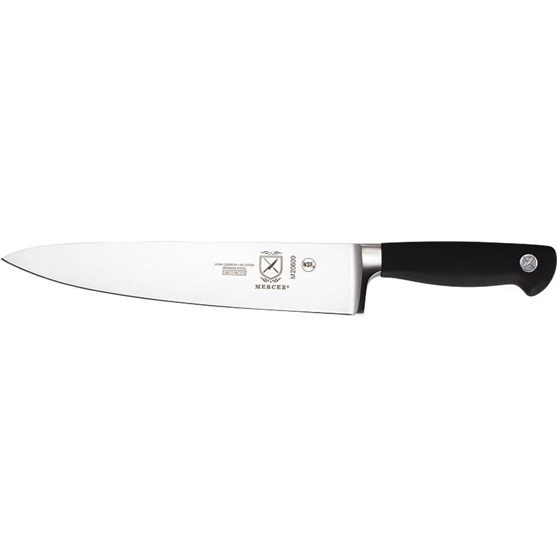 This Mercer Culinary® Genesis® Chef’s Knife is a 9″ size and is great for chopping, dicing, mincing, and slicing. It is made from high carbon German steel and has an ergonomic black Santoprene® handle.