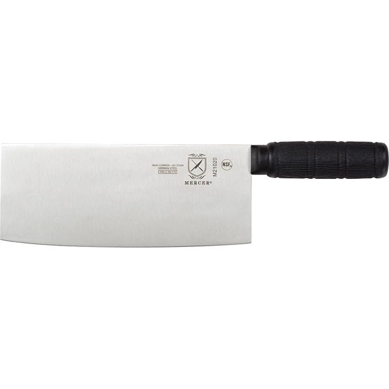 This Mercer Culinary® Chinese Chef’s Knife can be used to cut through thin or soft bones, or through hard vegetables. Its blade is made from German steel and it has a black Santoprene® handle.