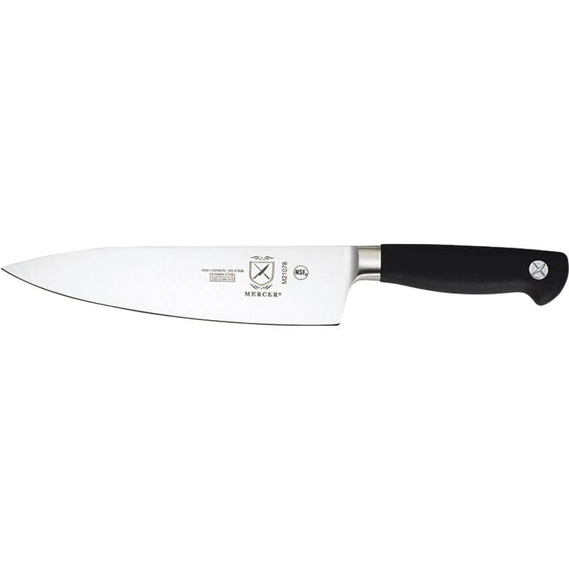 This Mercer Culinary® Genesis® Chef’s Knife is an 8″ size and is great for chopping, dicing, mincing, and slicing. It is made from high carbon German steel and has an ergonomic black Santoprene® handle.