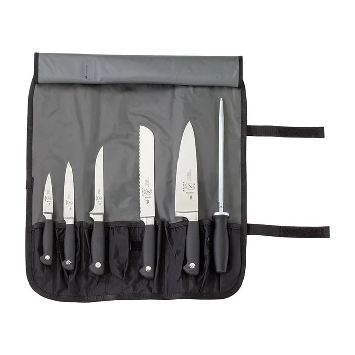 This Mercer Culinary® Genesis® Knife Roll Set includes six knives and one roll to hold them all. Each knife is made from high carbon German steel and has a black ergonomic Santoprene® handle. The roll is lightweight and has a fully adjustable and detachable shoulder strap.