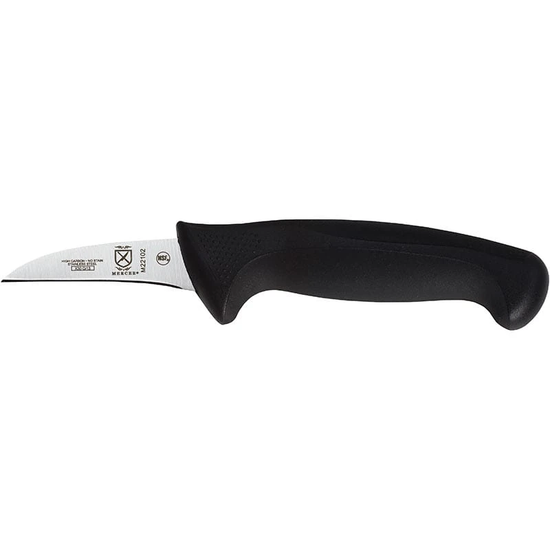 This Mercer Culinary® Millennia® Peeling Knife can peel vegetables or fruit with a curved surface. It has a high carbon stain-free Japanese steel blade and is finished with an ergonomic handle.