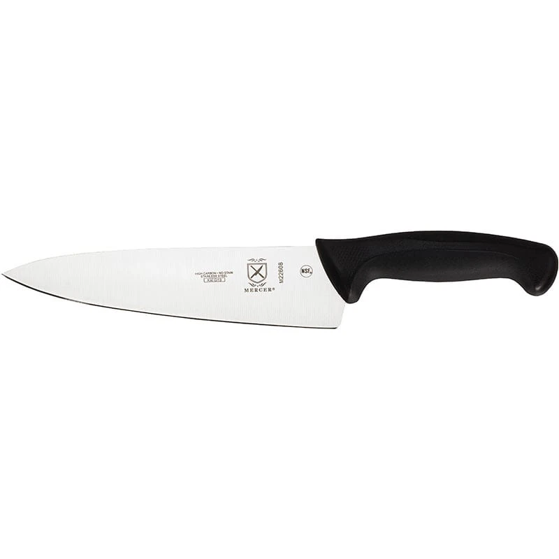 This Mercer Culinary® Millennia® Chef’s knife is an 8″ size and is great for chopping, dicing, mincing, slicing, and more. It features a Japanese steel blade and a black handle that is ergonomically designed for comfort.