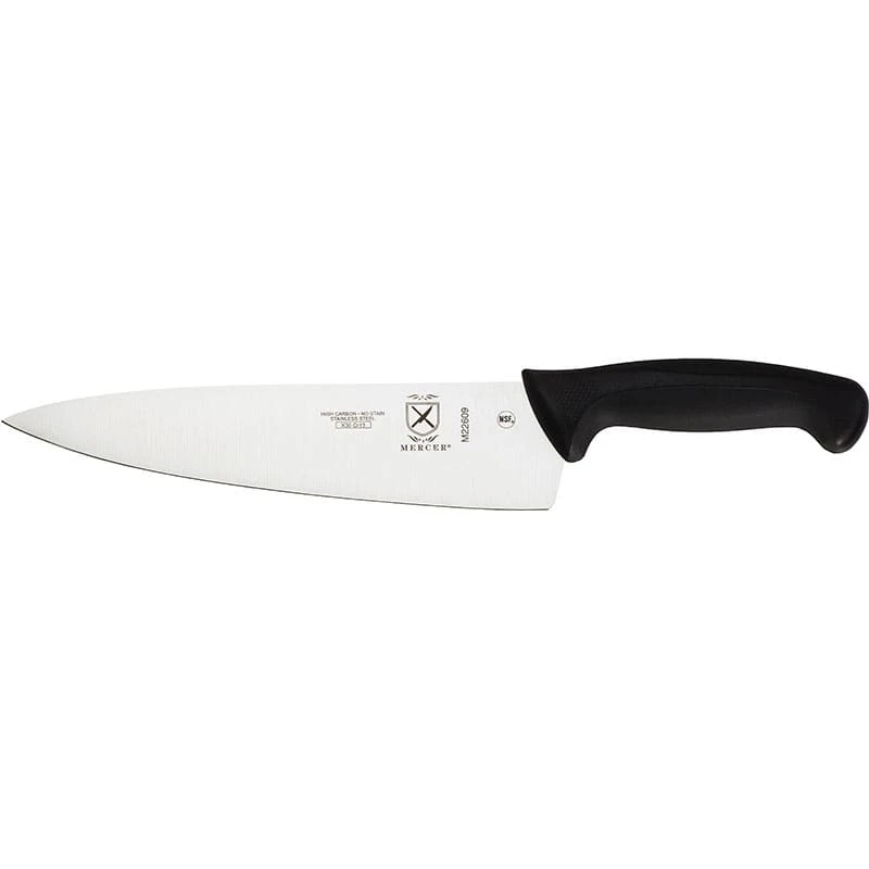 This Mercer Culinary® Millennia® Chef’s knife is a 9″ size and is great for chopping, dicing, mincing, slicing, and more. It features a Japanese steel blade and a black handle that is ergonomically designed for comfort.