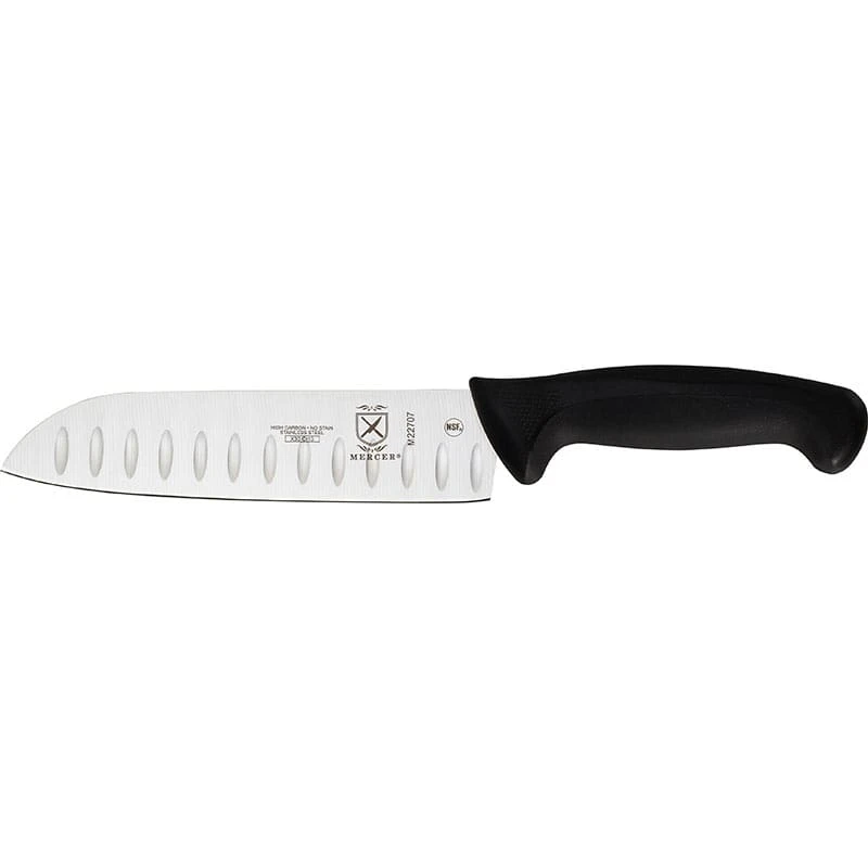 This Mercer Culinary® Millennia® Santoku knife is an all-purpose knife that is great for slicing, dicing, and mincing. It features a Japanese steel blade with a Granton edge. Its black handle is ergonomically designed for comfort.
