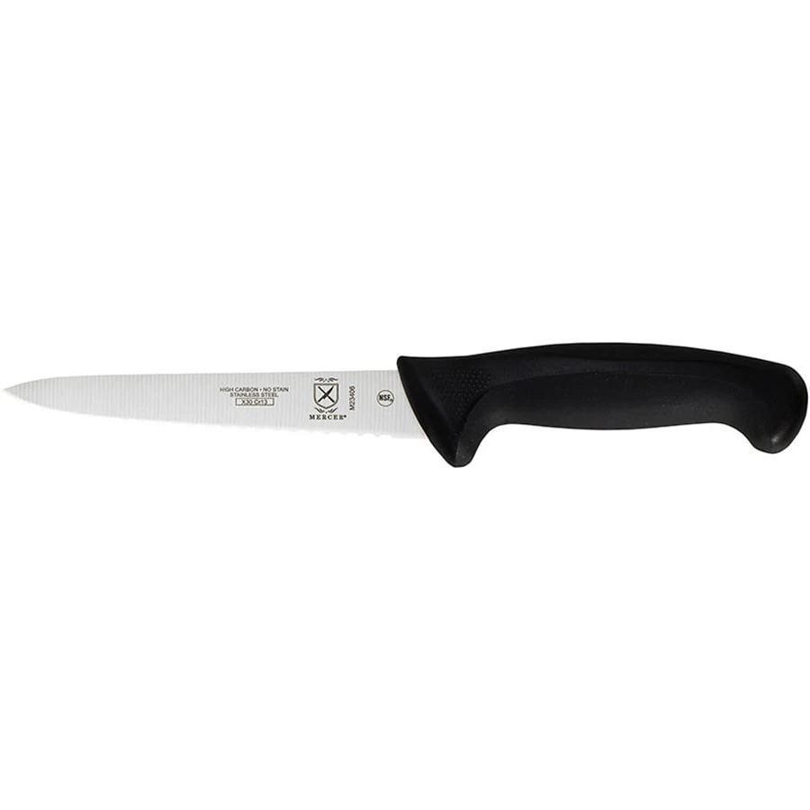 This Mercer Culinary® Millennia® Utility Knife has a wavy edge and is great for every day cutting tasks. It is finished with a black ergonomic handle for comfort during use.