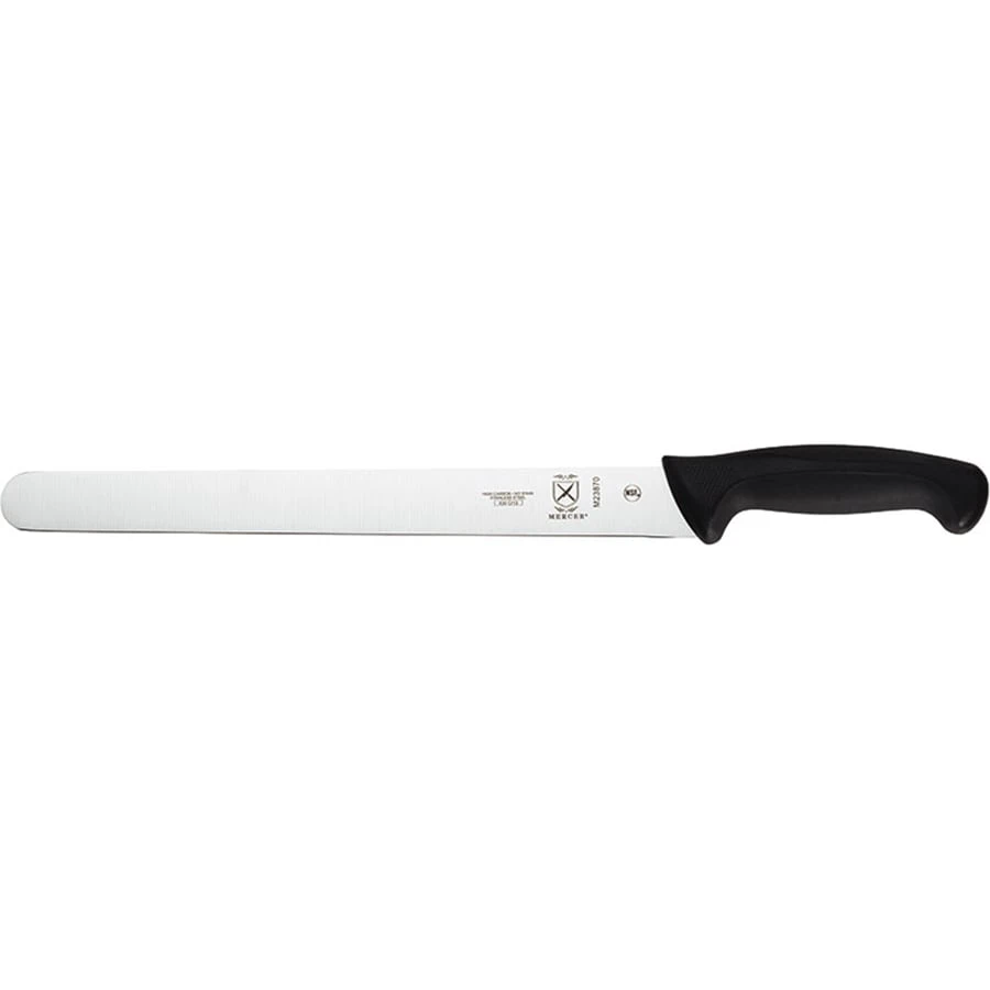 This Mercer Culinary® Millennia® Slicer Knife features a one-piece high carbon stain-free Japanese steel blade with a plain edge. It can be used to slice roasts and more. It is finished with a black ergonomic handle for comfort during use.