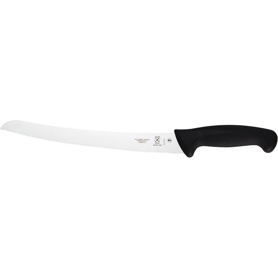 This Mercer Culinary® Millennia® Bread Knife is great for slicing fresh loaves of bread, sandwiches, tomatoes, and more. Its blade is made from one-piece high carbon steel, and it has a serrated edge. It is finished with a black ergonomic handle.