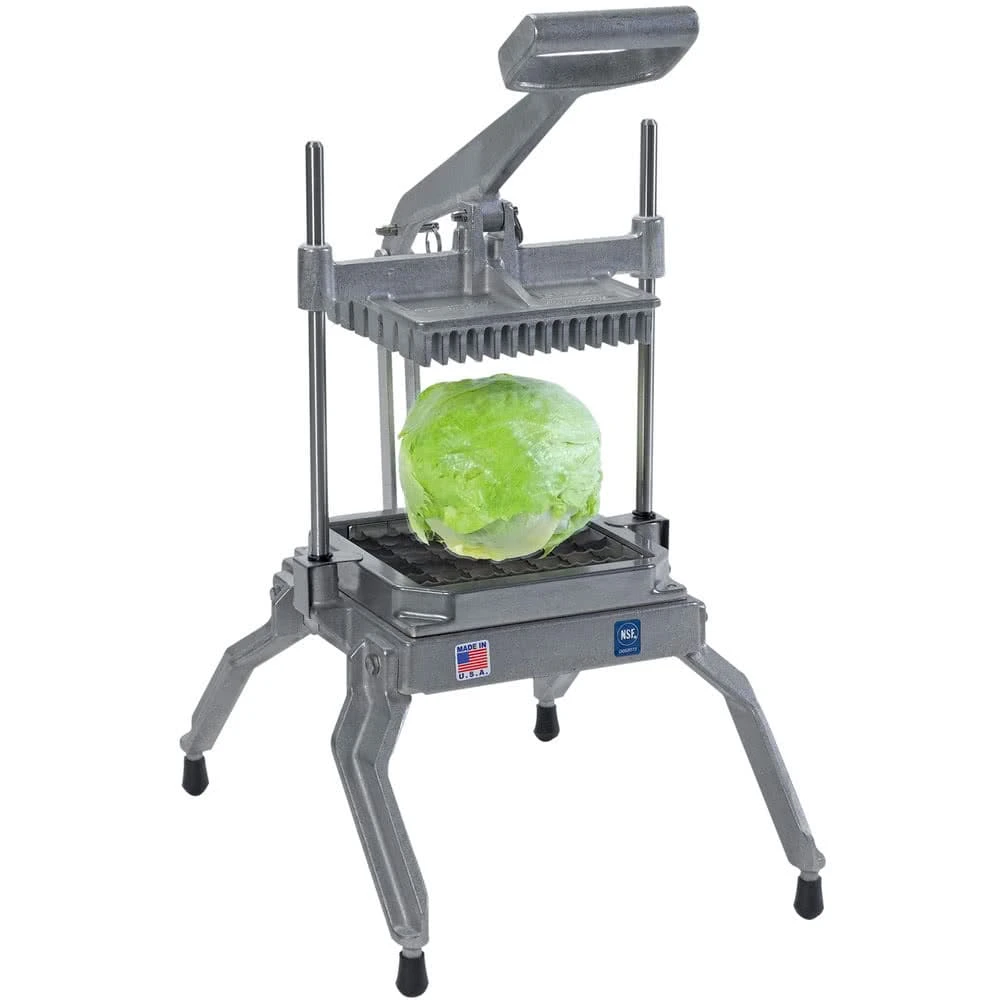 With this NEMCO® Easy LettuceKutter™, you can cut mounds of crisp, fresh lettuce in just seconds. Save time by processing a whole head of cored lettuce at a time. The scalloped blades and clean slicing action cut 3/4″ squares with no crushing or bruising. The blades are replaceable for long life and cleanup is easy. Just pull one pin to remove the pusher block. Clip-on blade assembly lifts out easily. The angled, cast aluminum legs with no-slip feet provide stable cutting platform. This LettuceKutter™ is perfect for use in every professional kitchen!